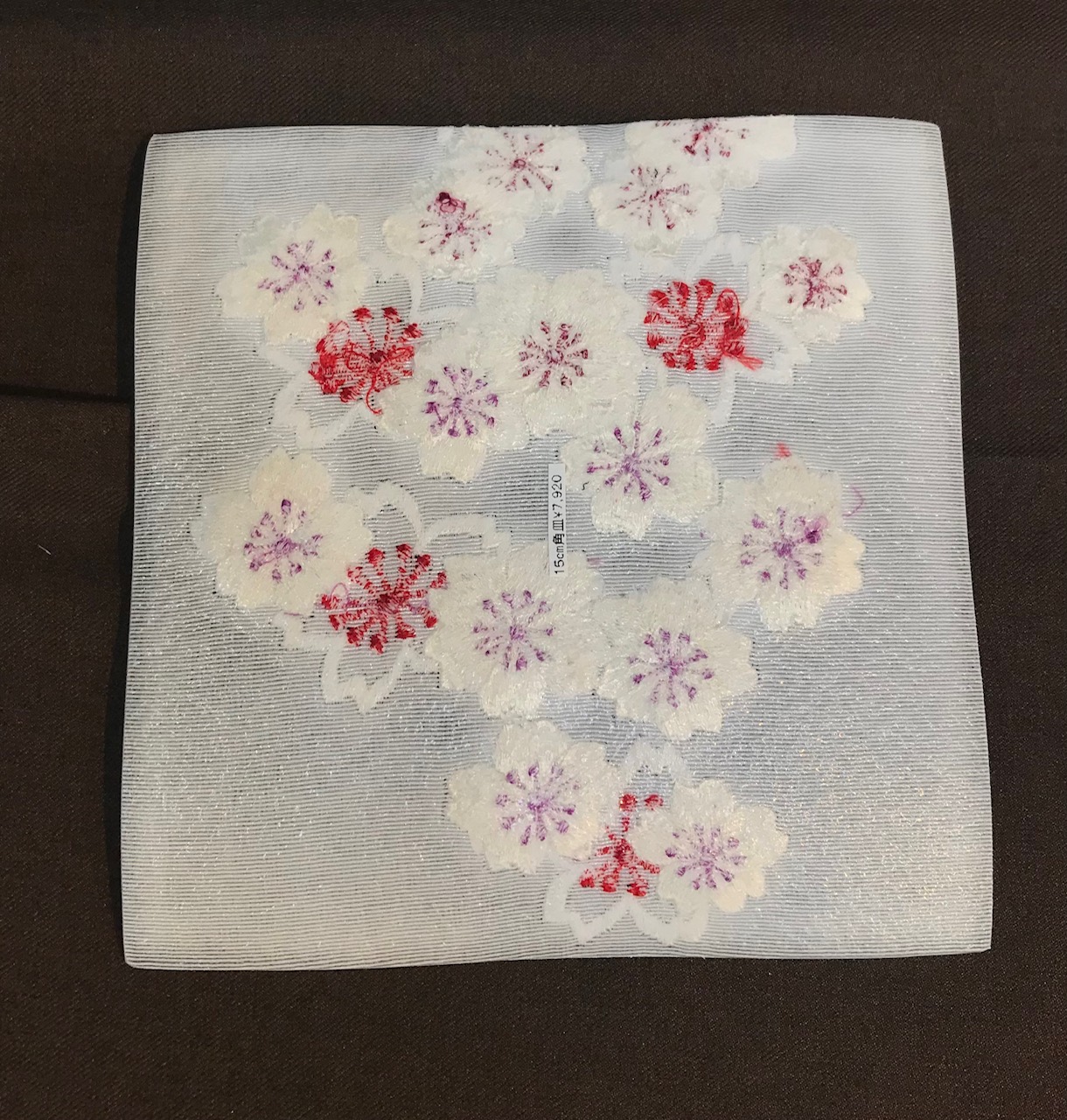 15㎝角皿ガラス食器に加工できます。画像のお皿は、素材の刺繍衿(桜柄)を透明のUVカットシートに密着させガラスと樹脂に挟み、高熱・圧縮でガラスコーテング加工を施しました。