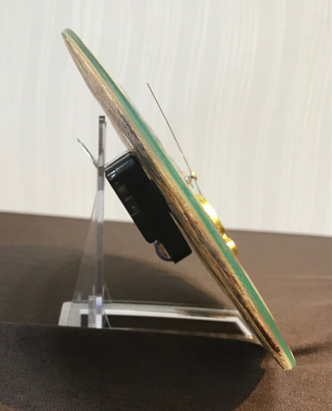 ・中心に10㎜の穴を開け、時計ユニットをはめます。文字盤にはアラビヤ数字の文字を貼ります。