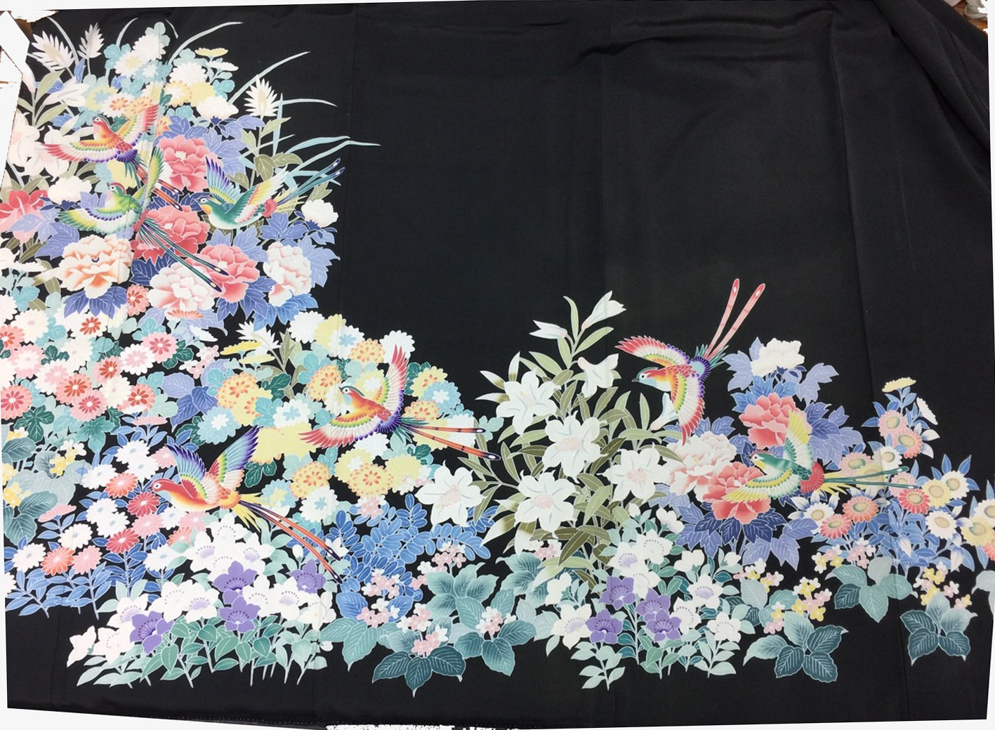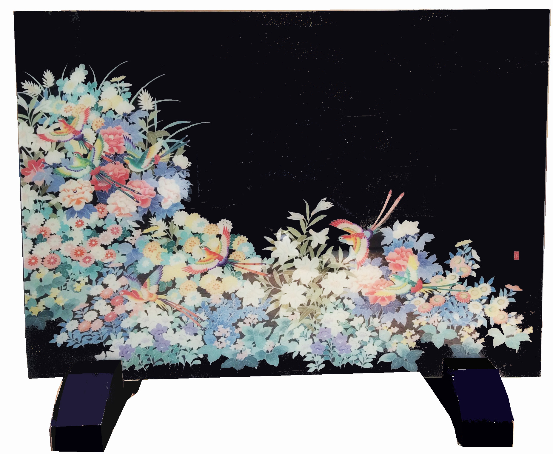 お客様から留袖や色留袖をお預かりして、縦90×横110㎝、厚み1㎝の両面ガラス衝立に加工した場合の加工賃になります。画像はサンプルの想い出の加賀友禅留袖です。お客様からお預かりする留袖は、刺繍など凹凸がないものに限り、このような両面ガラス衝立に加工できます。もし凹凸があると、圧縮することでガラスにヒビが入る恐れがあるため、その場合は裏面が樹脂コーテングされた枠付きの衝立加工になります。