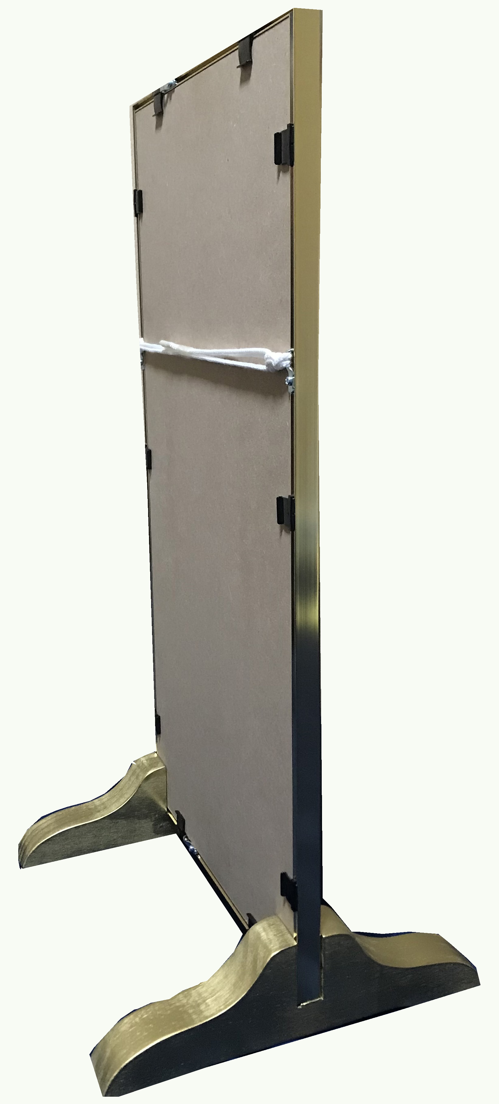ガラスパネルサイズは60×30㎝、これをアルミ額にはめ込むと壁掛けになり、脚を付けると床に据え置くことができます。