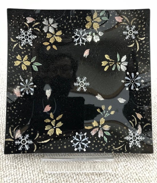 20cm角「紺地ガラス友禅皿(水結晶柄)」皿立付