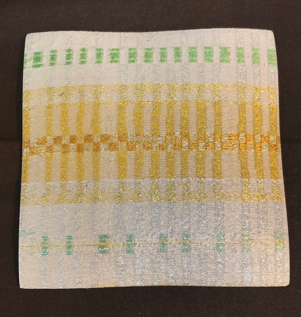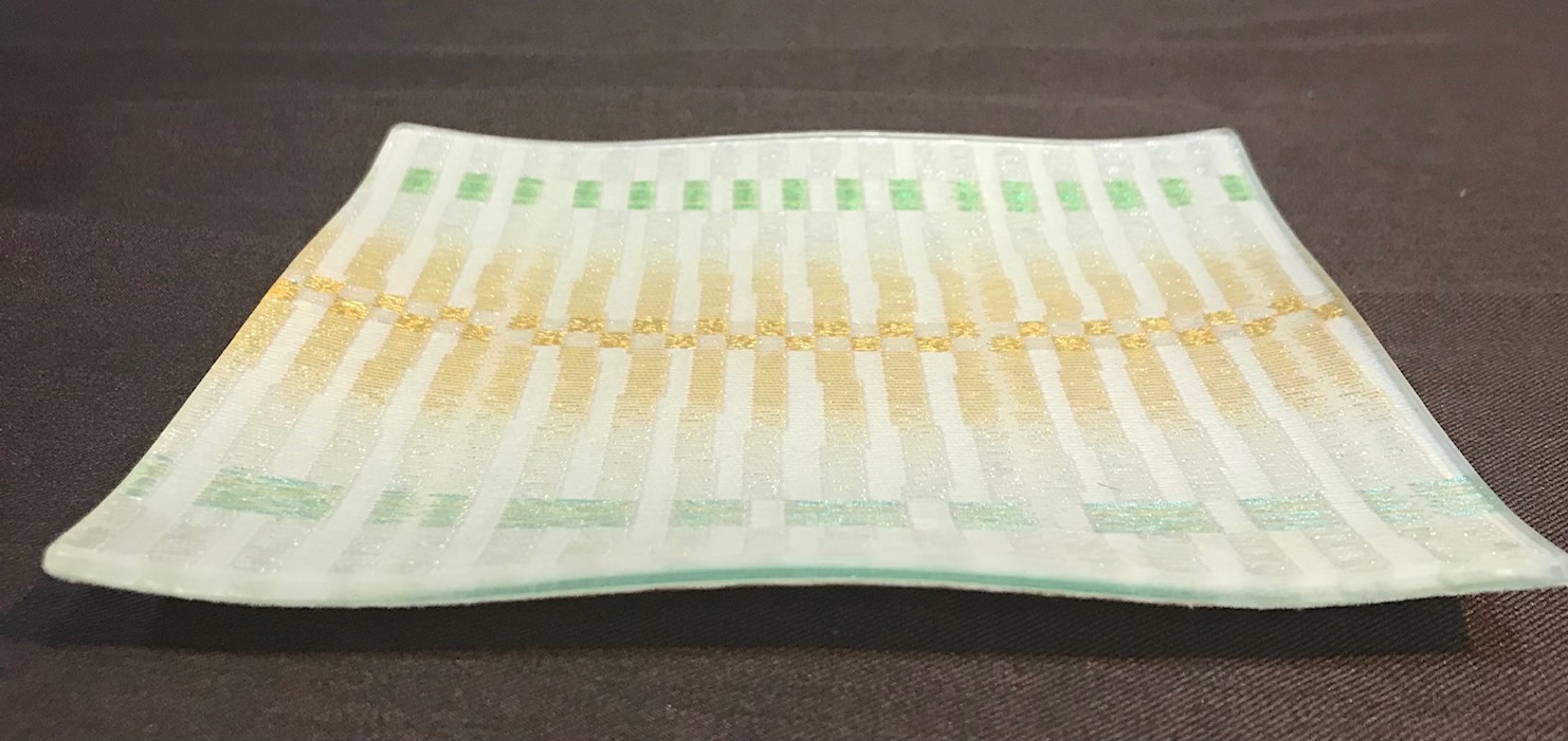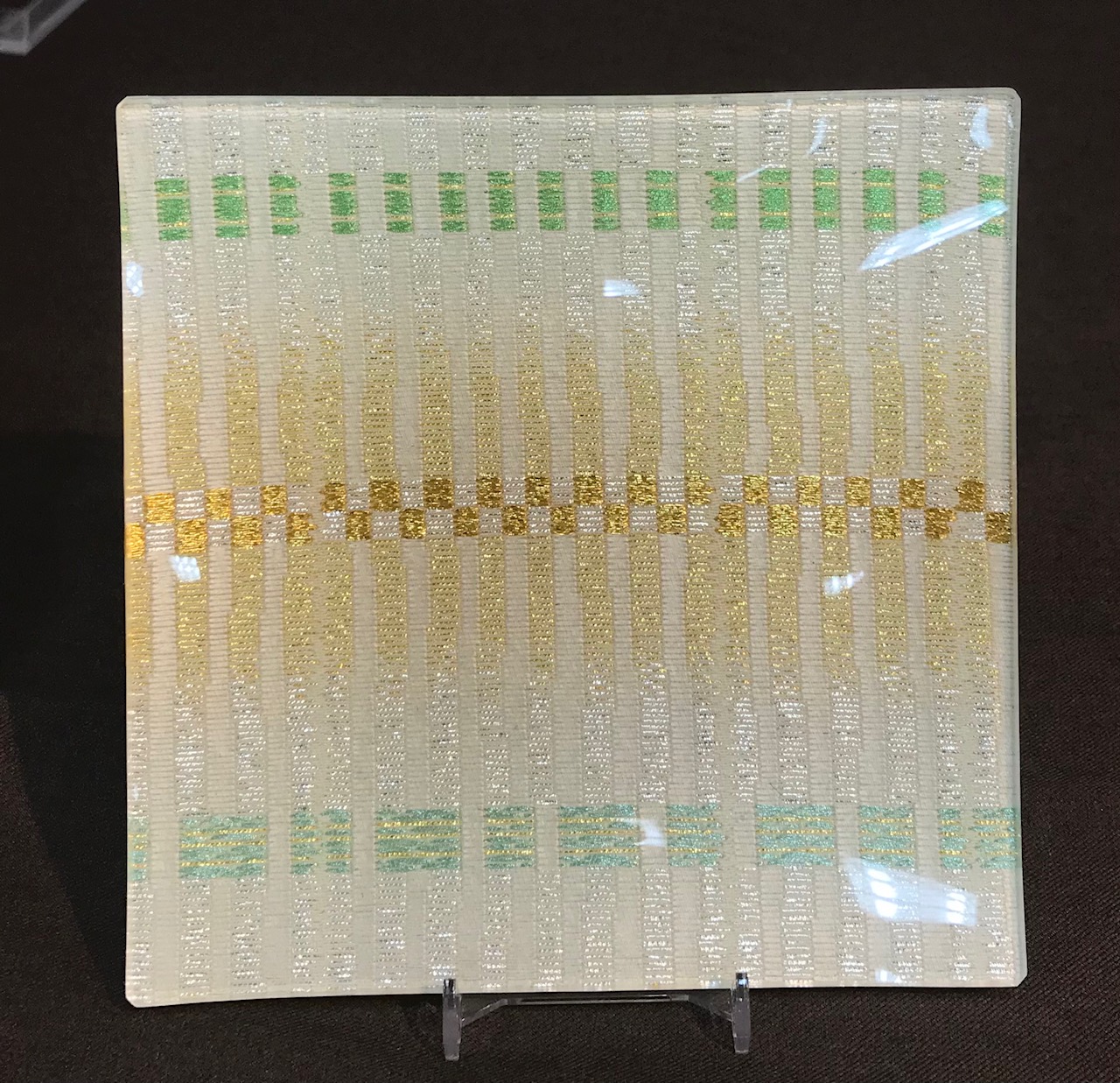 画像のお皿は、西陣織帯地を透明のUVカットシートに密着させガラスと樹脂に挟み、高熱・圧縮でガラスコーテング加工を施しました。