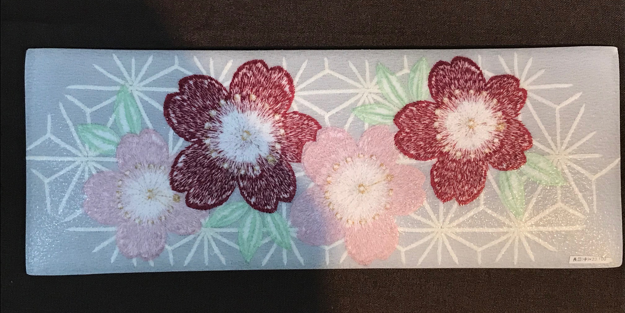画像のお皿は、振袖用刺繍衿(桜柄)を透明のUVカットシートに密着させガラスと樹脂に挟み、高熱・圧縮でガラスコーテング加工を施しました。
