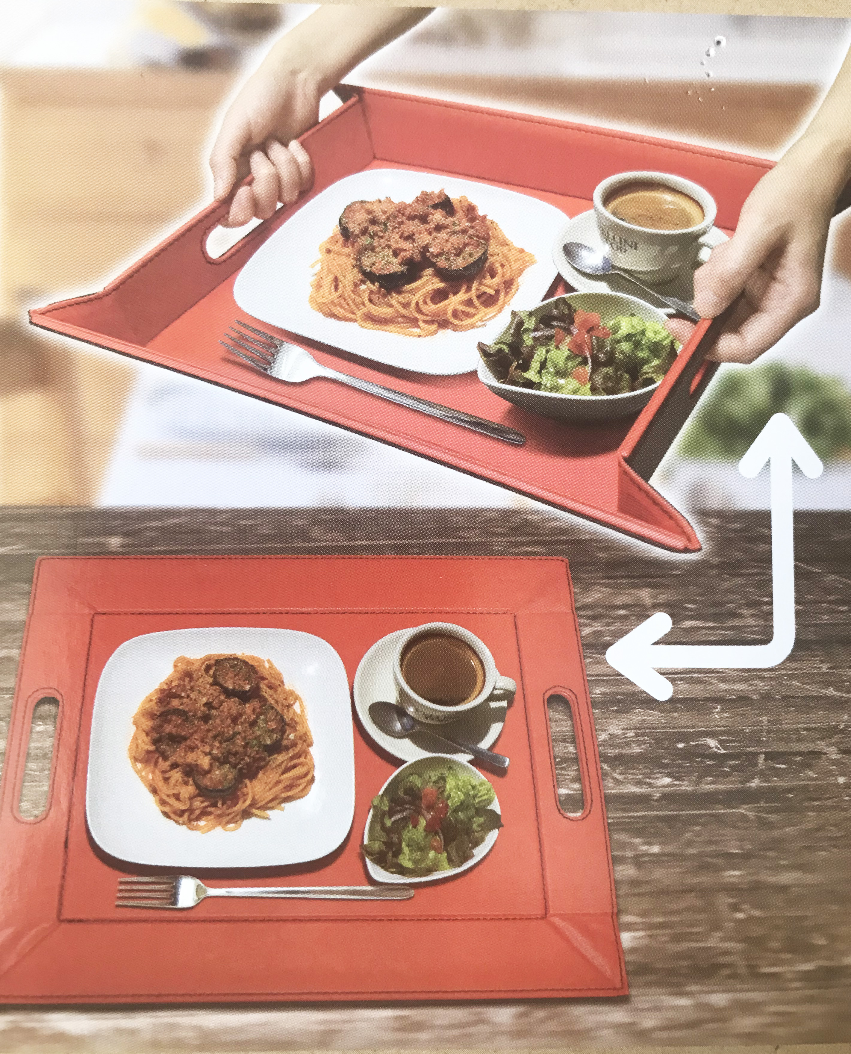 西陣織帯地を両面樹脂マットで挟み、退色防止のUVシートで高温・加圧プレスでコーテング加工してあります。その樹脂マットを英国デザインのトレー兼ランチョンマットに敷きオシャレなフリートレーにリメイクしました。調理した料理をすぐテーブルへ運べ、後片付けも素早く、簡単にできます。取っ手を持ち上げると自然にトレーに、置くとテーブルマットになる2WAY仕様。耐熱温度は80度までOK.