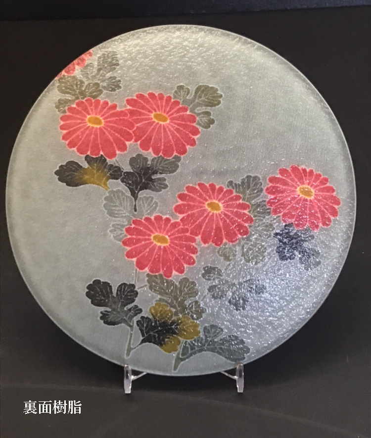 大切なお客様のおもてなしにいかがですか!そのまま食材を乗せたオシャレな食器として或いは絵皿として飾れます。 【商品情報】 ●サイズ 15cm丸皿 ●素材 表面:ガラス ●中の素材:シルク ●裏面:樹脂 ●厚み 3mm ●その他 紙箱入り