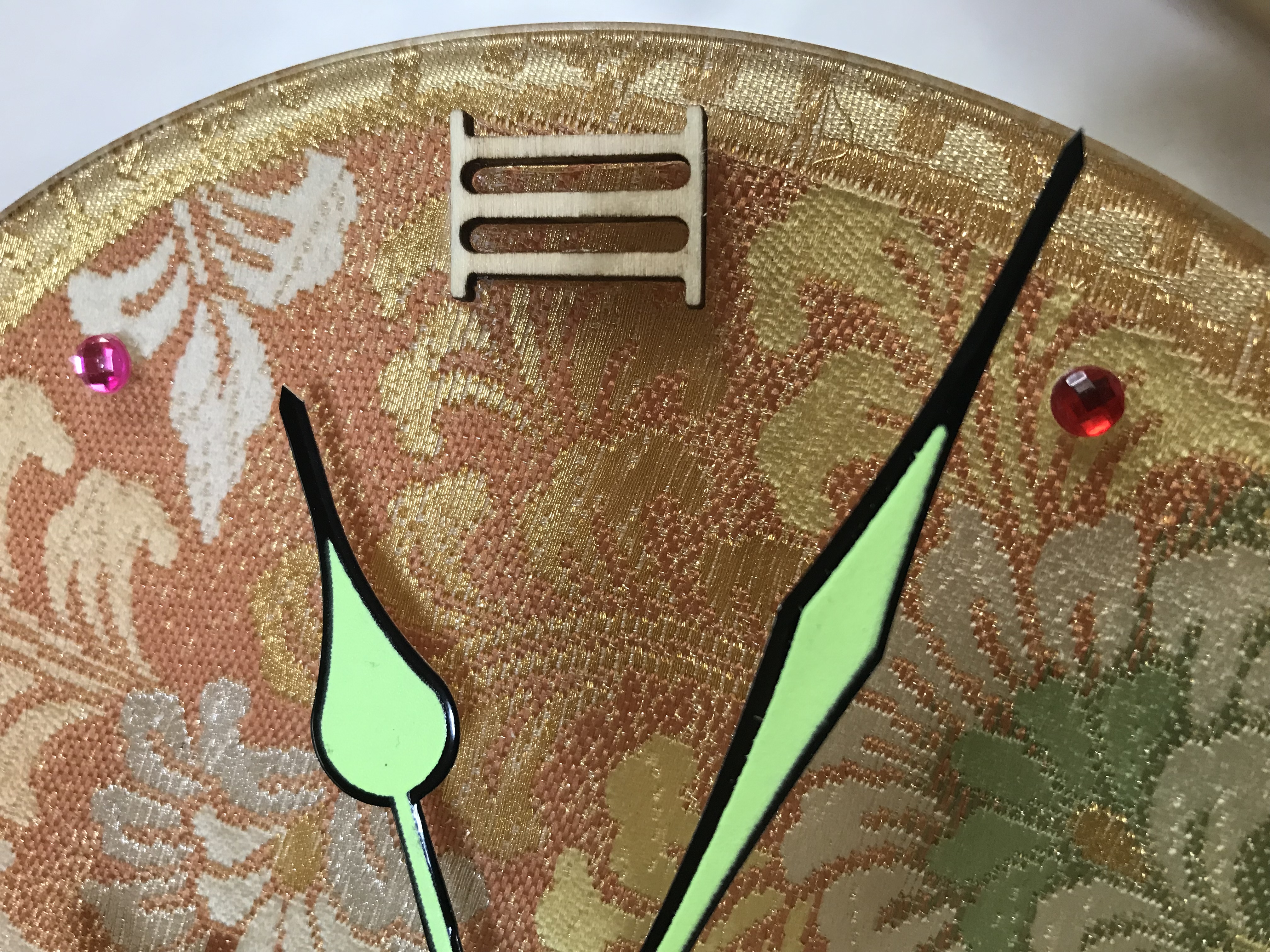 画像の時計は、帯地織布を透明のUVカットシートに密着させガラスと樹脂に挟み、高熱・圧縮でガラスコーテング加工を施しました。